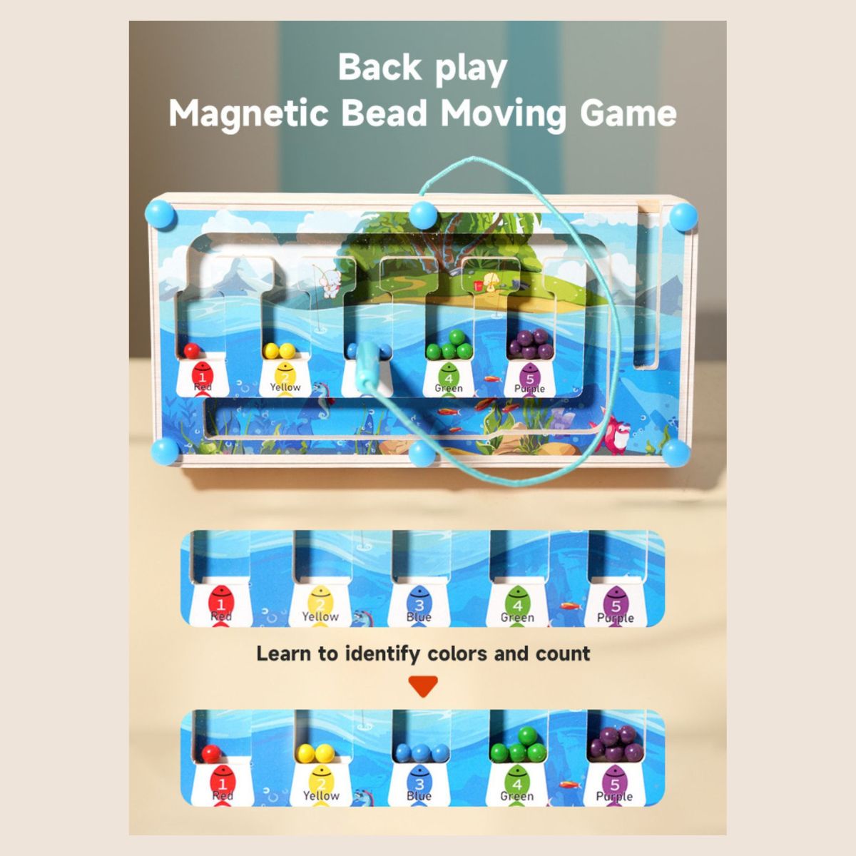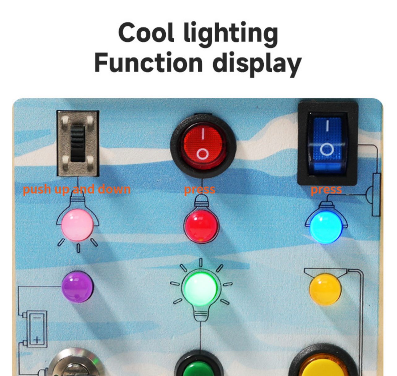 Ühel pool magnetkuulidega värvide ja numbrite õppemäng, teisel LED-lülitid.