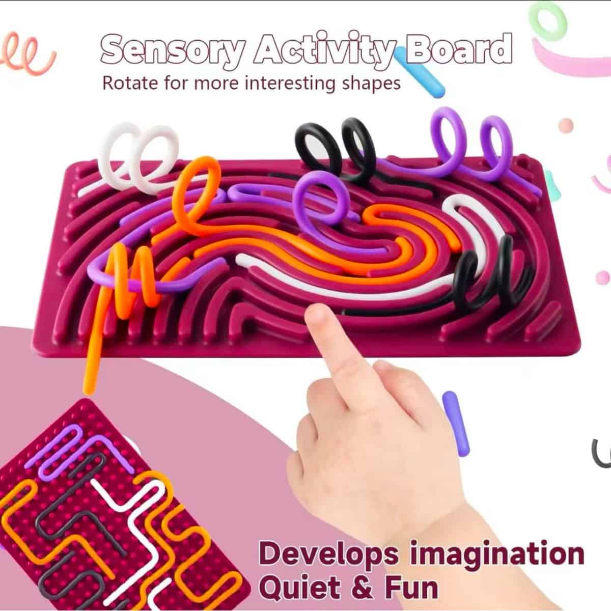 Tahvel sisaldab 11 painduvat silikoonist pulka, mis võimaldavad lastel vajutada, venitada ja manipuleerida, pakkudes rahustavat ja keskendumist soodustavat kogemust.