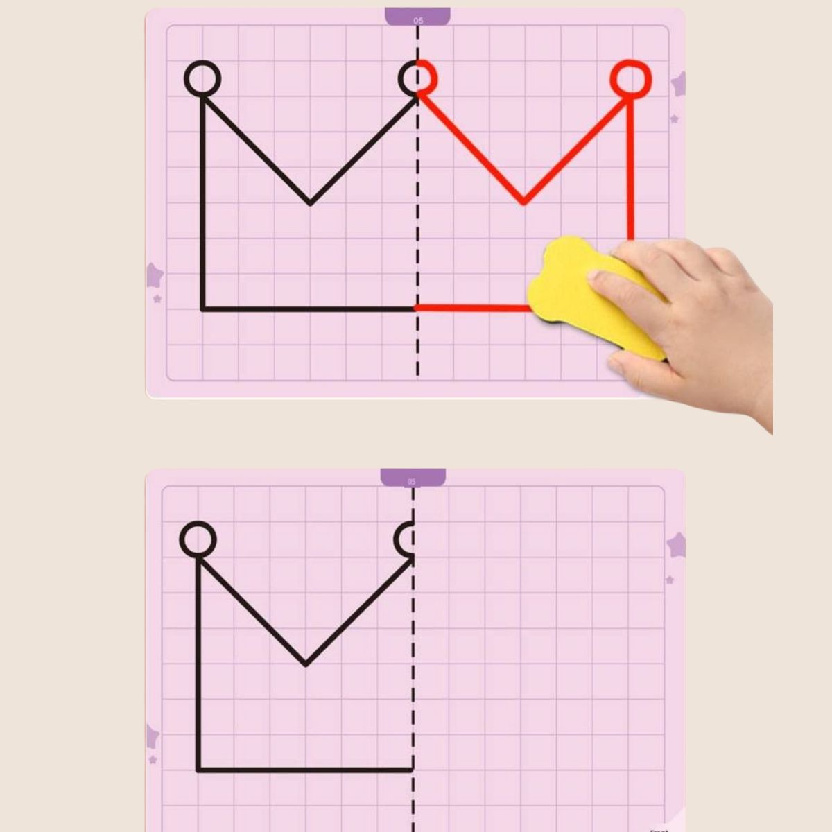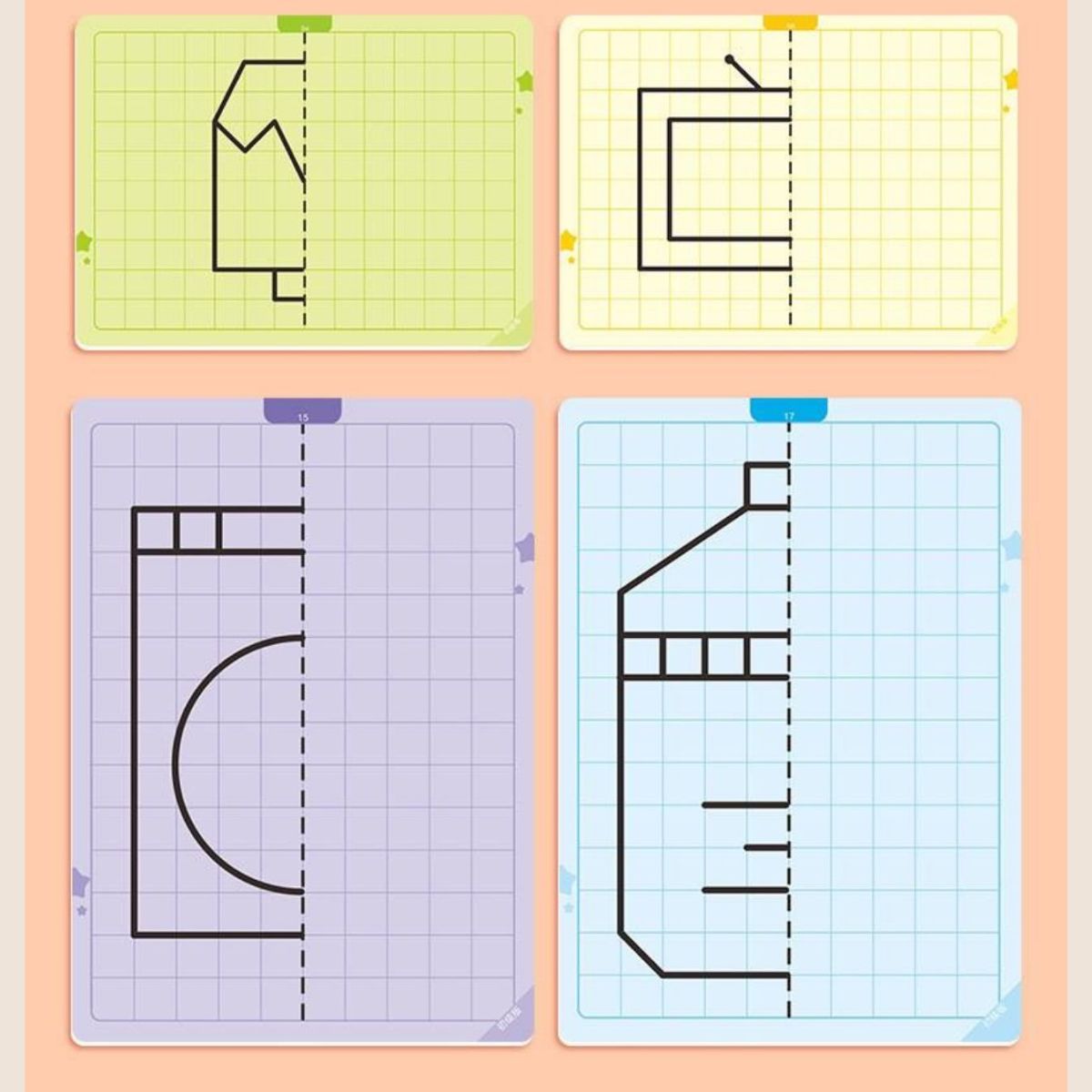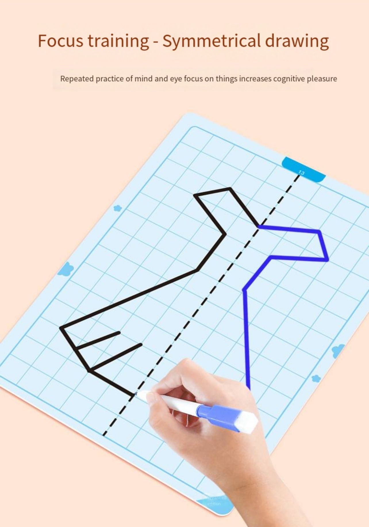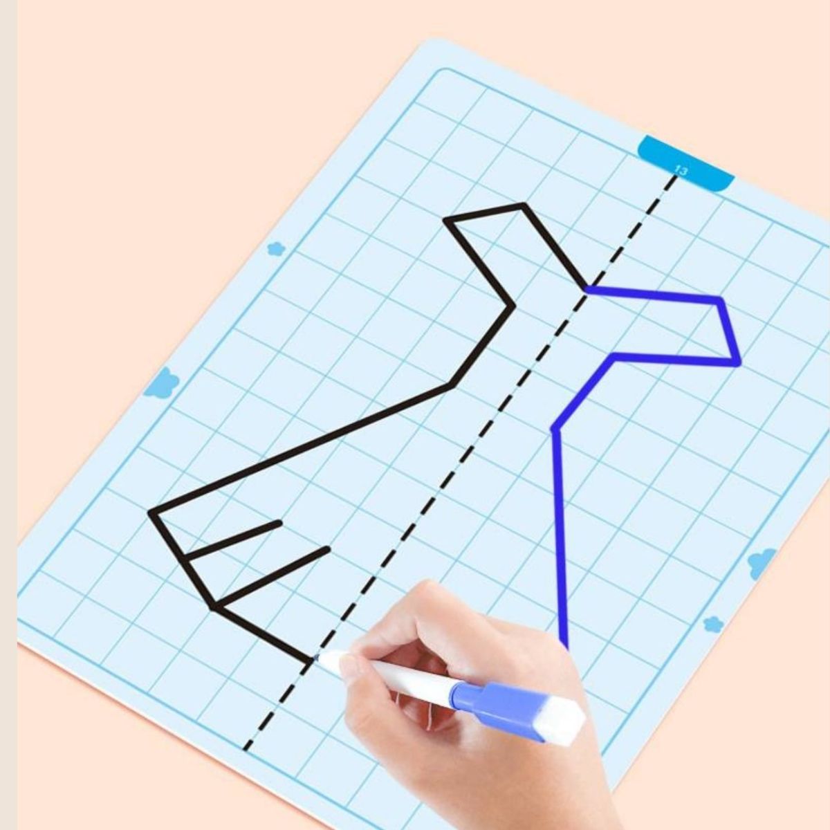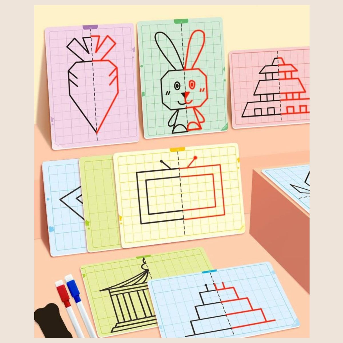 Sümmeetria joonistamise mäng pakub lastele nutikat viisi, kuidas õppida joonistamise kaudu sümmeetria põhimõtteid. Komplektis on 20 taaskasutatavat mustriga kaarti erineva raskusastmega, mis sobivad nii algajatele kui edasijõudnutele. Iga kaart julgustab last looma sümmeetrilist kujundit, arendades seeläbi peenmotoorikat, visuaalset taju ja mõtlemisoskust.